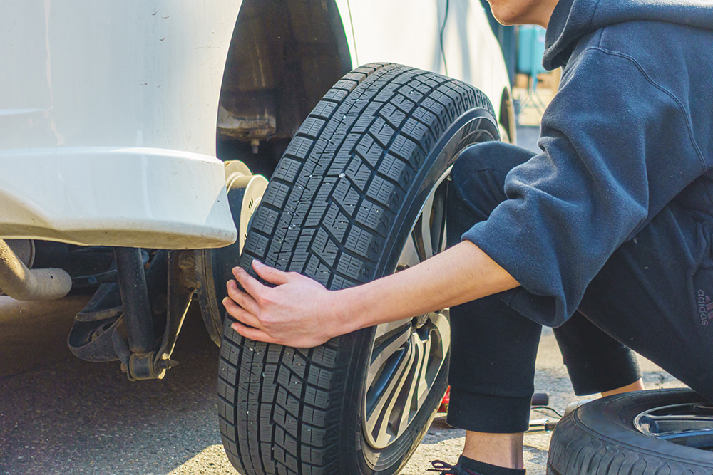 車からタイヤ(ホイール付)を取り外し、持参したタイヤに付け替えます。パンク修理にも対応可能です。